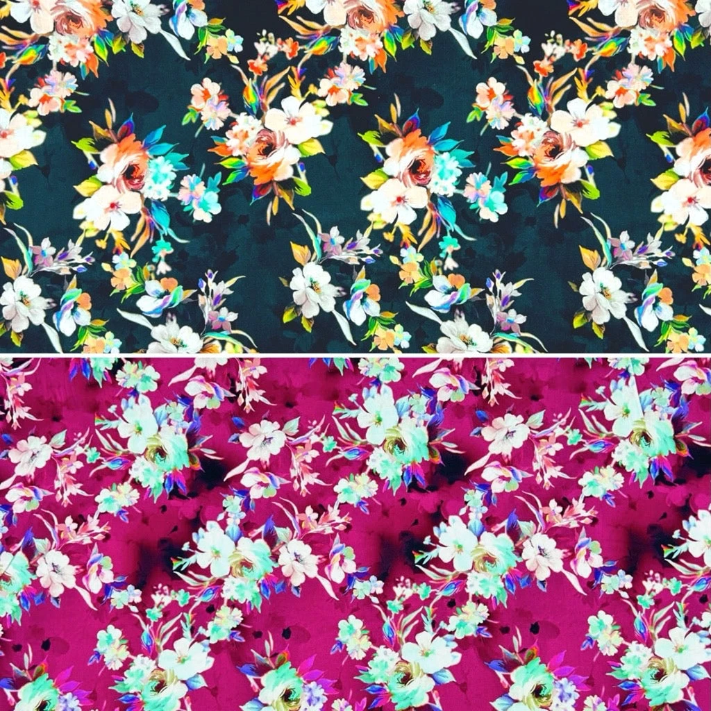 A digitally printed viscose poplin fabric featuring a multicoloured floral print. This soft and lightweight fabric features a gorgeous drape and would be suitable for tops, skirts, dresses, accessories and more! Available in 2 colours.