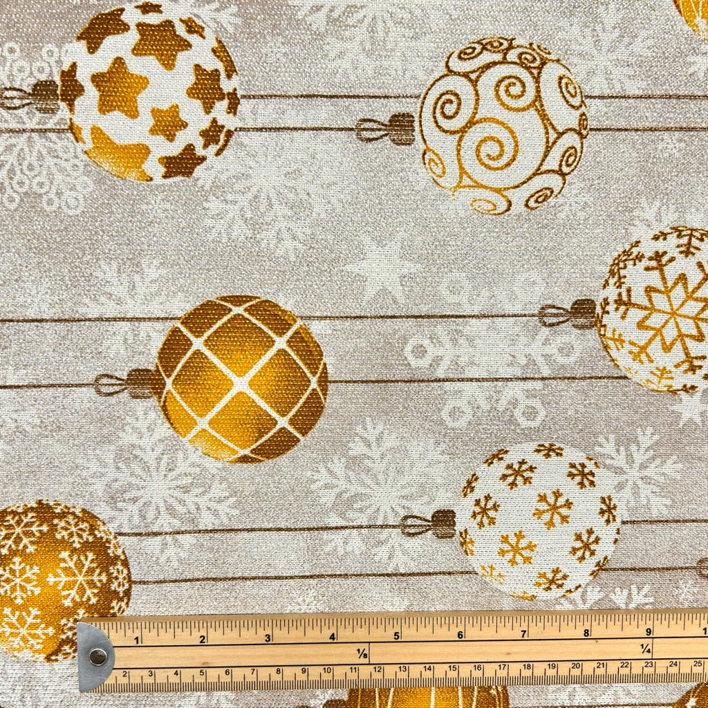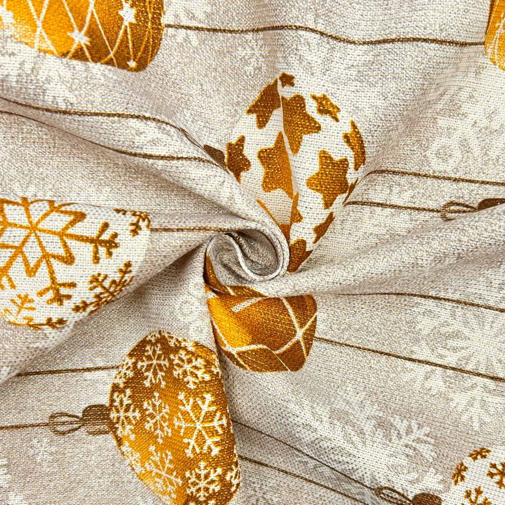 This lightweight, printed tapestry fabric featuring a Christmas themed print. Tapestry is a fine woven cloth, made by weaving coloured threads. The weave is built up to create a pattern and can often be reversible.ย Suitable for home soft furnishing such as curtains, upholstery and bedspreads, cushions and bean bags etc. It features gold lurex threads running through that add a wonderful touch of sparkle which add texture and vibrance to your home!