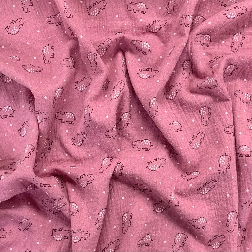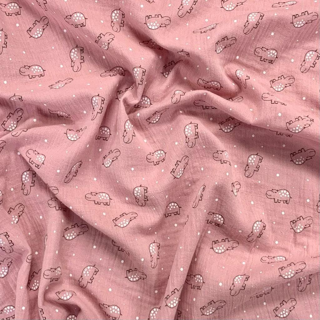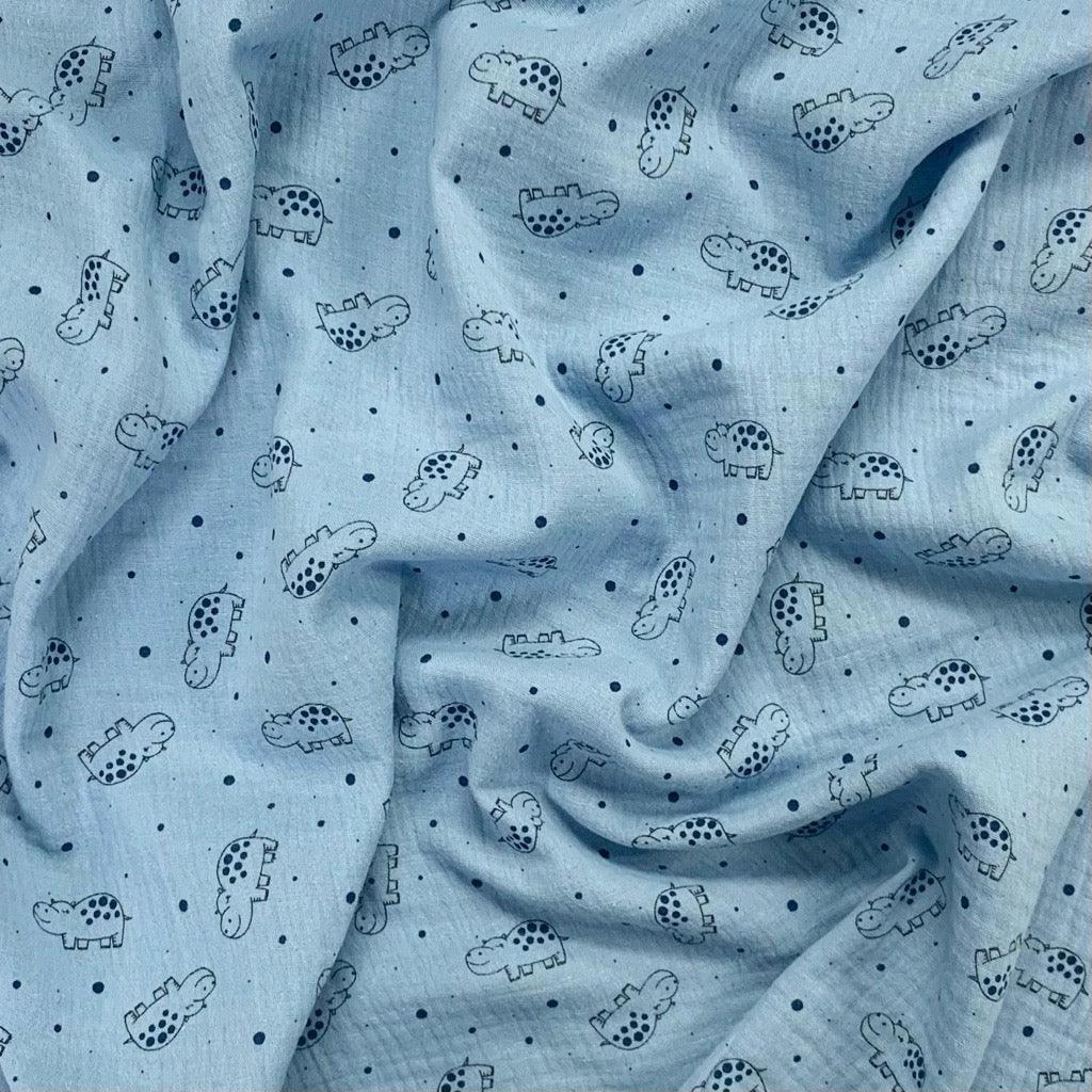 Create comfortable, breathable, and adorable garments with our Hippo Print Double Gauze Fabric. Specifically designed for delicate skin, this soft muslin fabric provides the perfect balance of durability and airiness, making it an essential choice for handcrafted baby clothing, lightweight summer dresses, and nursery accessories.
