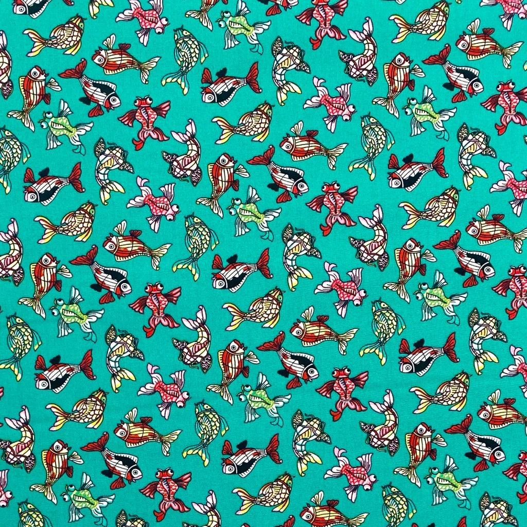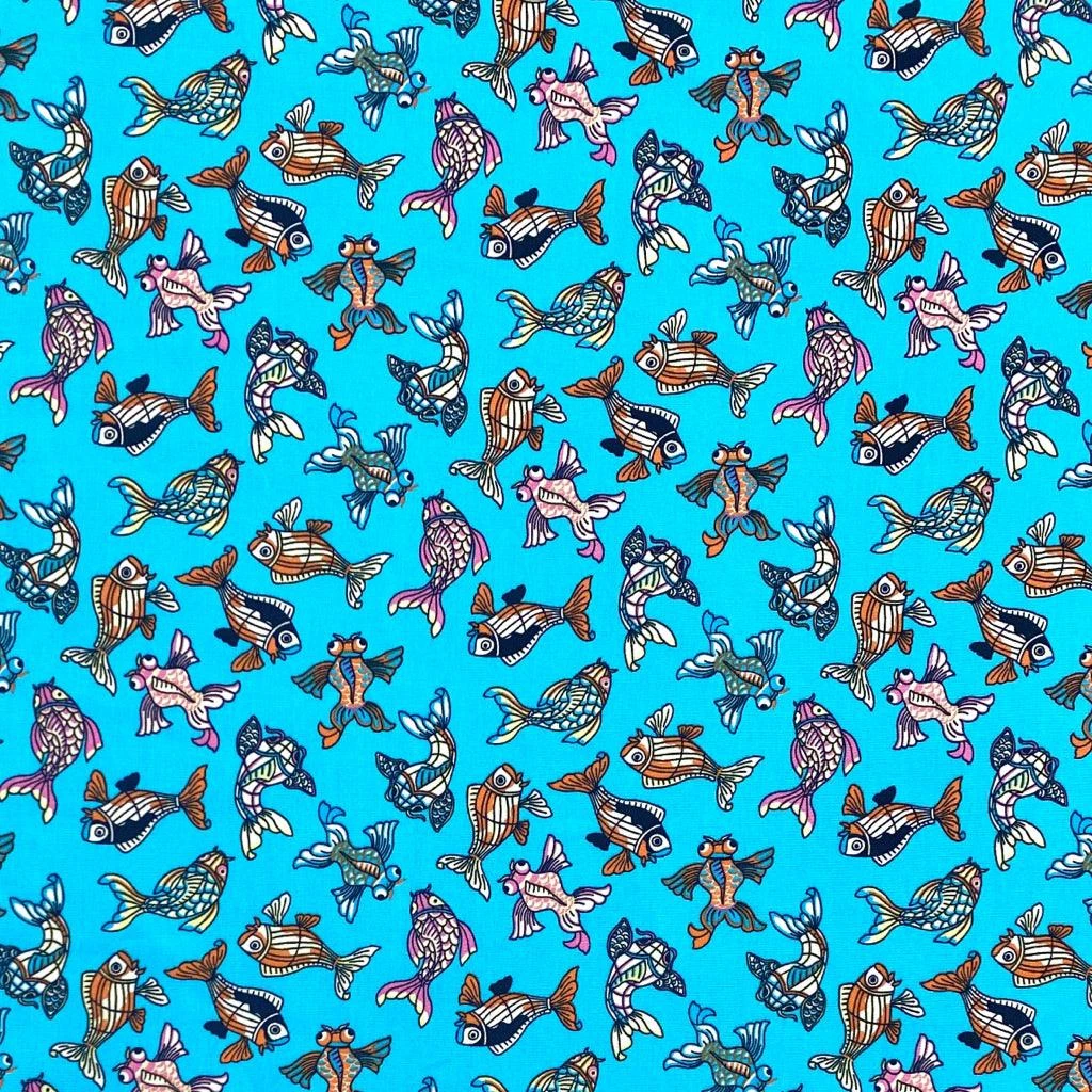 Aย Rose & Hubble cotton poplin fabric featuring multicoloured fish. Suitable forย tops, skirts, dresses, accessories and more!