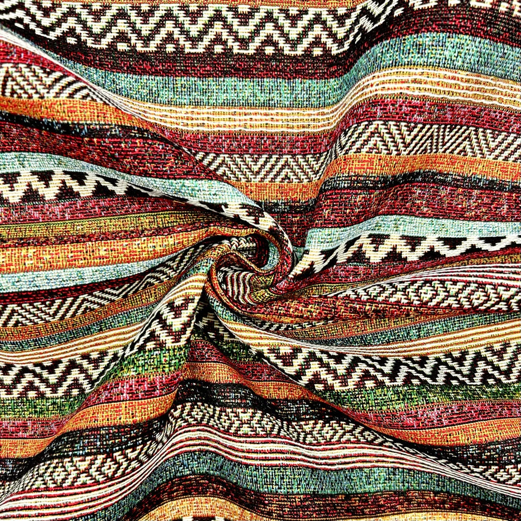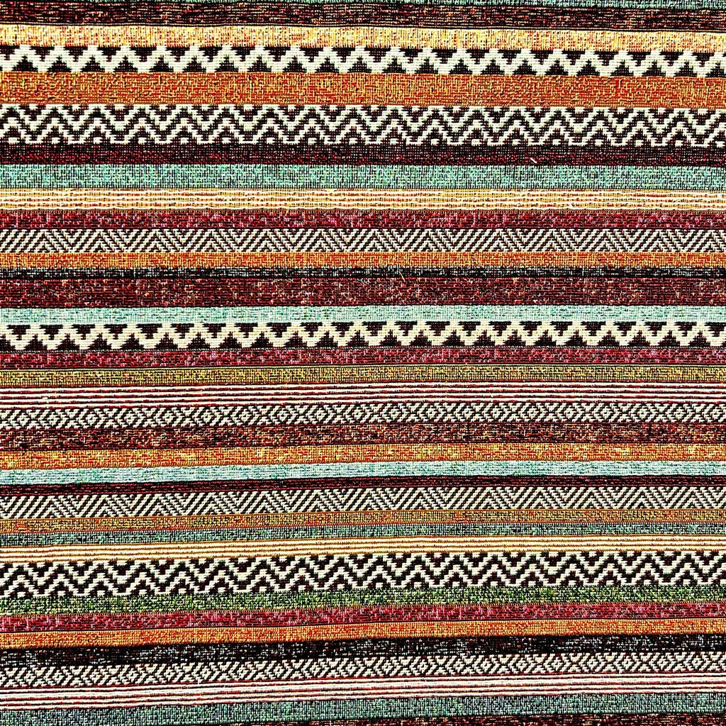 A printed tapestry fabric featuring a stripes print. Tapestry is a fine woven cloth, made by weaving coloured threads. The weave is built up to create a pattern and can often be reversible.ย Suitable for home soft furnishing such as curtains, upholstery and bedspreads, cushions and bean bags etc. Thisย fabric will add texture and vibrance into your home.ย