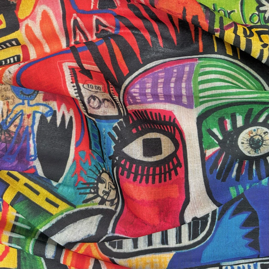 Elevate your wardrobe with the Urban Faces Faux Silk collection. This exquisite fabric combines the natural elegance of silk with a modern blend of bamboo and viscose, offering a luxurious feel and a stunning multicoloured print that catches the eye.