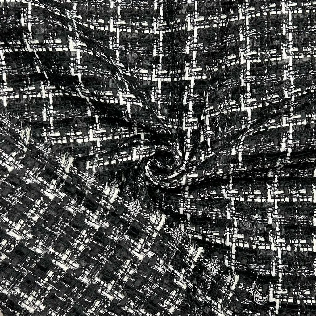 Bring timeless elegance to your wardrobe with this stunning white check on black tweed fabric. This boucle material features a sophisticated raised knotted yarn that provides a rich, tactile texture similar to high-end designer textiles. Infused with silver lurex threads, it offers a subtle yet captivating sparkle, making it the perfect choice for garments that require a touch of luxury and structure.